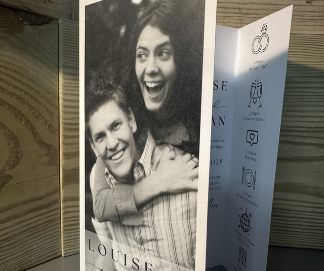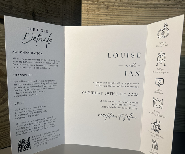 Printed onto high quality 300gsm bright white cardstock using a high definition digital printing press. When closed, they are a neat 148mm x 210mm. When opened, the measure an impressive 210 x 297mm - lots of space for your invitation and guest information.