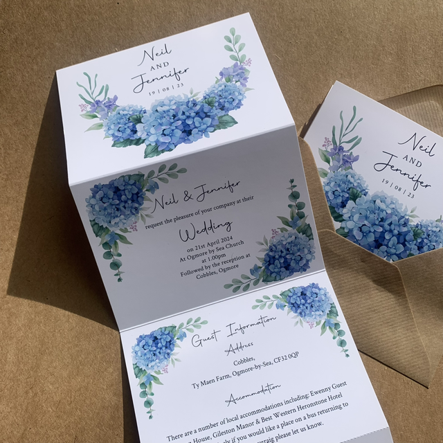 Blue hydrangea design - concertina wedding invitations - including guest information & tear off RSVP postcard