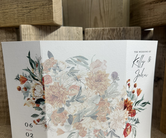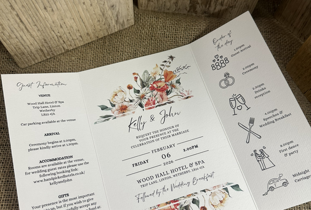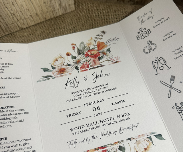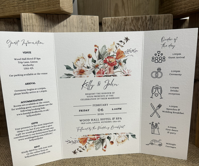 The rich burnt orange florals add warmth and style, while the gatefold design gives you plenty of space to include everything your guests need. Inside, there’s room for the main wording, guest information such as accommodation or gifts, and even an order of the day timeline so everyone knows what to expect. We also include a free RSVP QR code to make replies quick and simple.