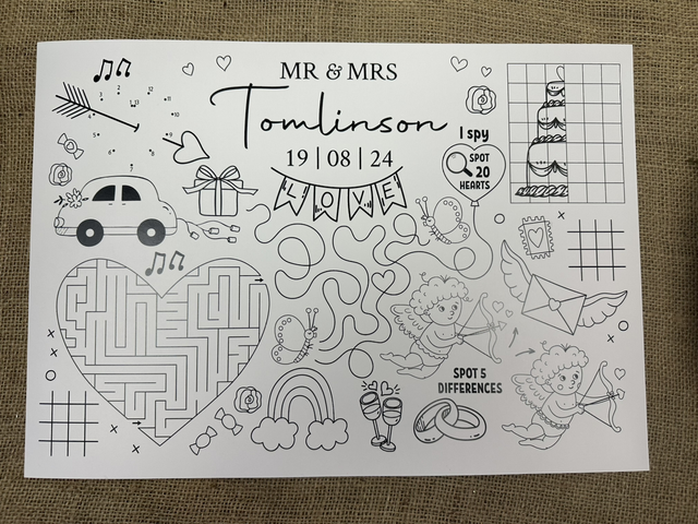 Children’s A3 wedding activity placemats - personalised with the happy couple’s name & wedding date