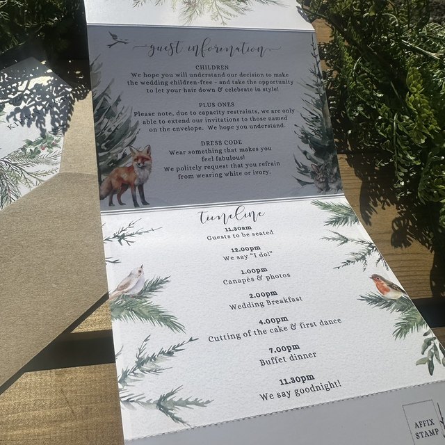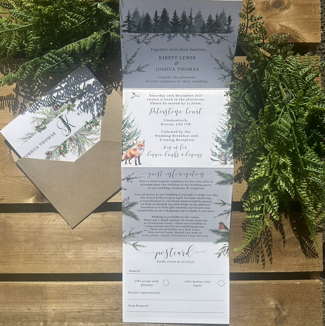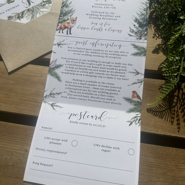 “Coco” winter forest scene collection - concertina Wedding invitations - including guest information & RSVP