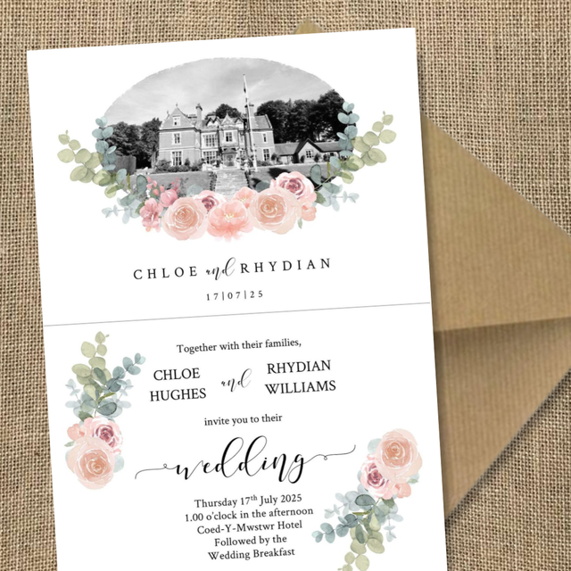 Coed-y-mwstwr venue image invitation - concertina Wedding invitations - including guest information & RSVP