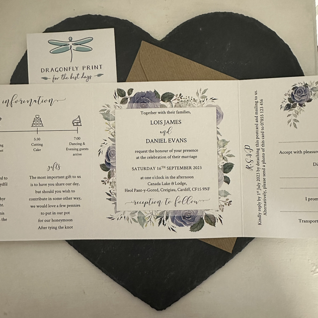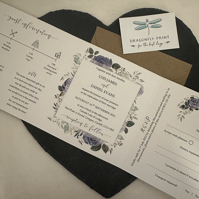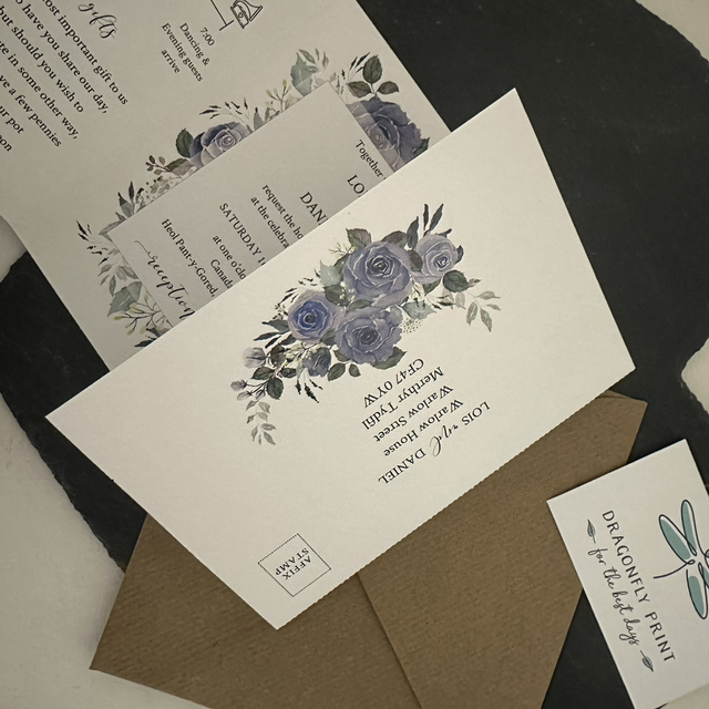 Dark dusty blue / navy floral wedding invitations - including invitation, menu, menu choice tear off RSVP card and outer envelope