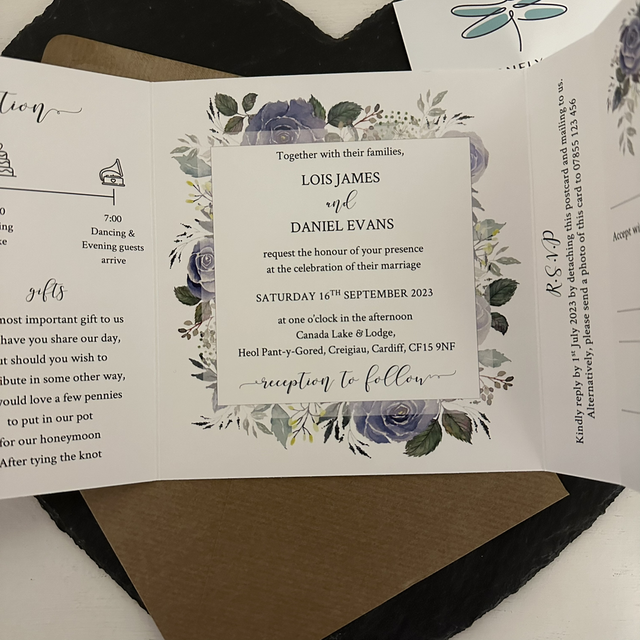 Introducing our beautiful blue florals square tri fold wedding invitations, perfect for your special day! These beautiful invitations measure 148.5mm x 140mm when folded, and when opened up, they expand to an impressive 148.5mm x 420mm. With ample space for guest information, a wedding day timeline, and even a tear-off and return RSVP card, our tri fold invitations are the epitome of elegance and functionality.