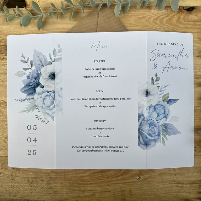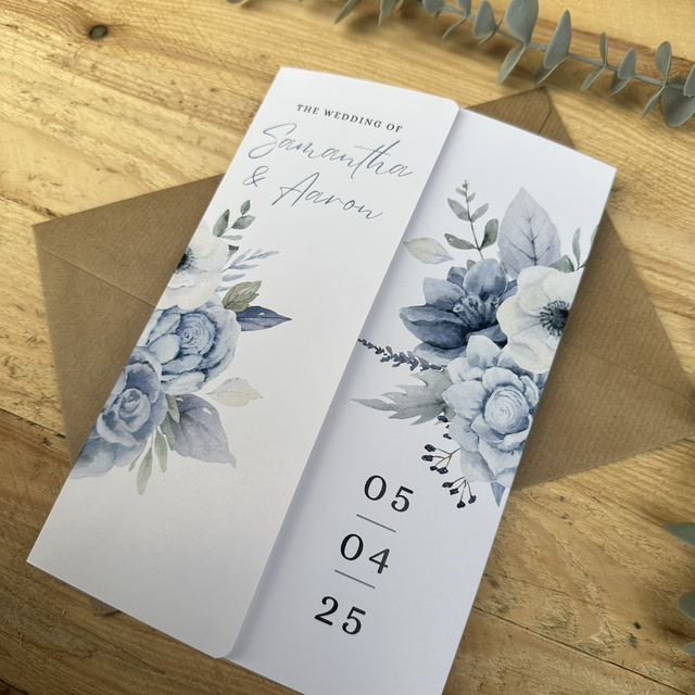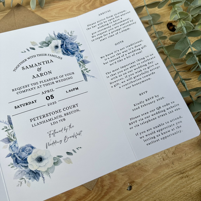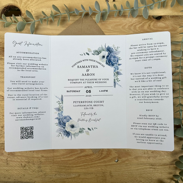 Dusty blue, sage green and white floral design Gatefold Wedding Invitations – Personalised, Includes RSVP QR Code and Envelopes