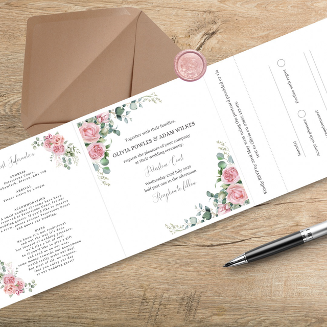 Dusty rose & eucalyptus- square, tri-fold Wedding invitations - including guest information & RSVP