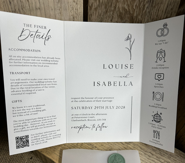 Printed on 300gsm laid cardstock, these invitations have a subtle off-white textured finish that feels high quality in hand. When opened out they measure 210mm x 297mm – spacious yet neatly presented.