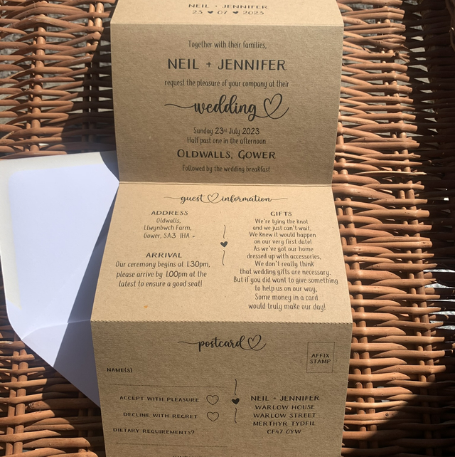 These beautiful invitations measure 148.5mm x 105mm when folded, and when opened up, they expand to an impressive 148.5mm x 420mm. With ample space for guest information, a wedding day timeline, and even a tear-off and return RSVP card, our concertina fold invitations are the epitome of elegance and functionality.