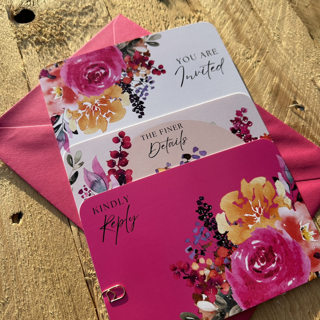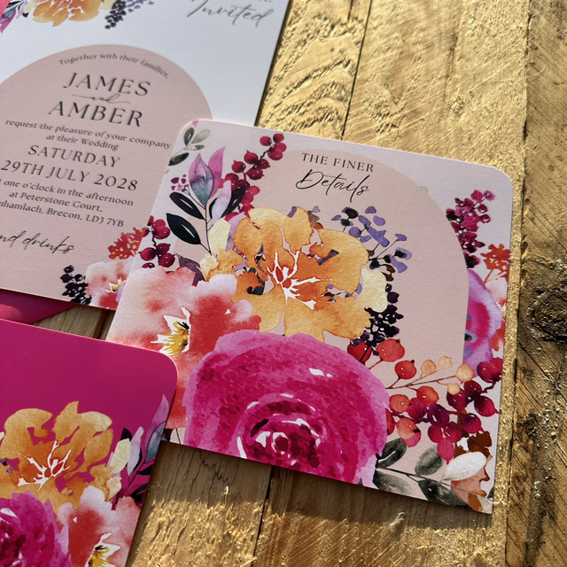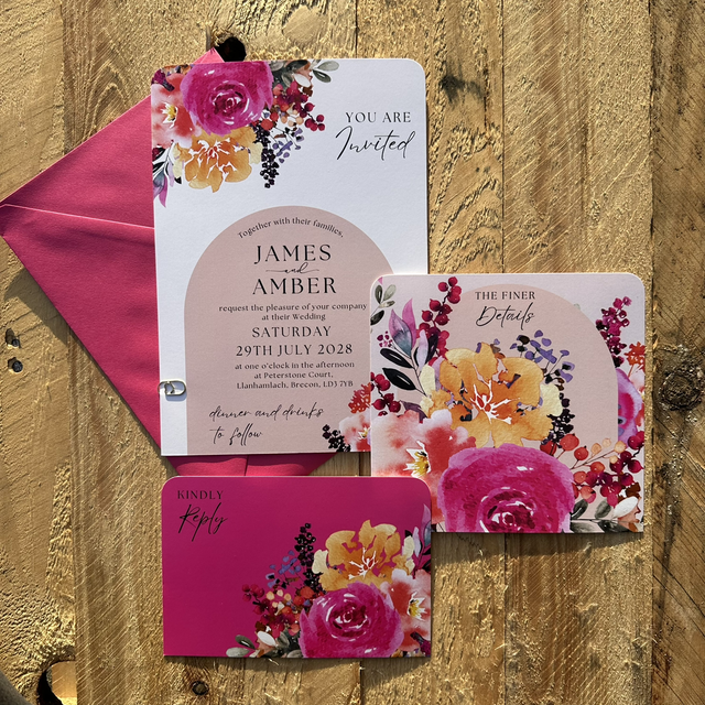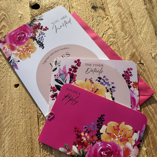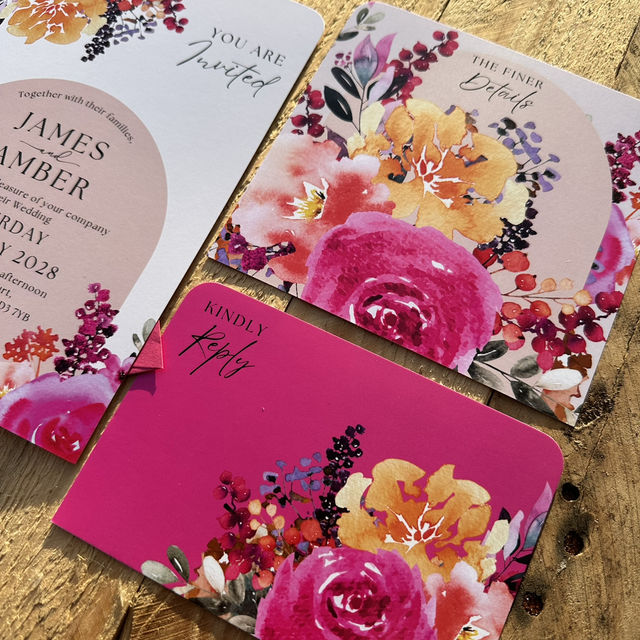 The design showcases a lush floral arrangement with pops of fuchsia, orange, and deep berry tones, perfect for a modern wedding with a burst of colour. Each card is printed on high-quality, sturdy cardstock, with rounded corners for a soft, elegant finish. This invitation suite adds a touch of sophistication and flair to your big day, leaving a lasting impression on your guests.
