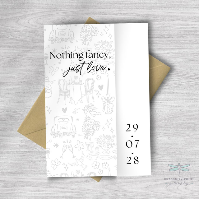 “Maddie” whimsical doodle design - Nothing fancy, just love - Black and white monochrome - Gatefold Wedding invitation