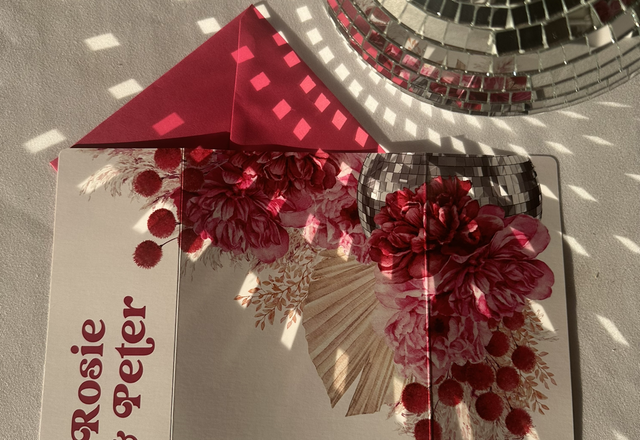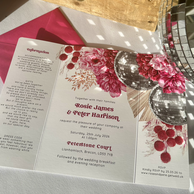 Mirror balls, hot pink and burgundy florals - Gatefold Wedding invitation