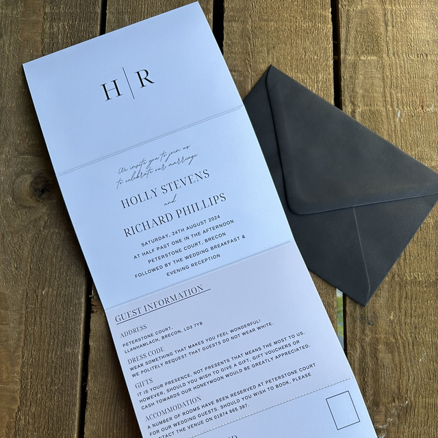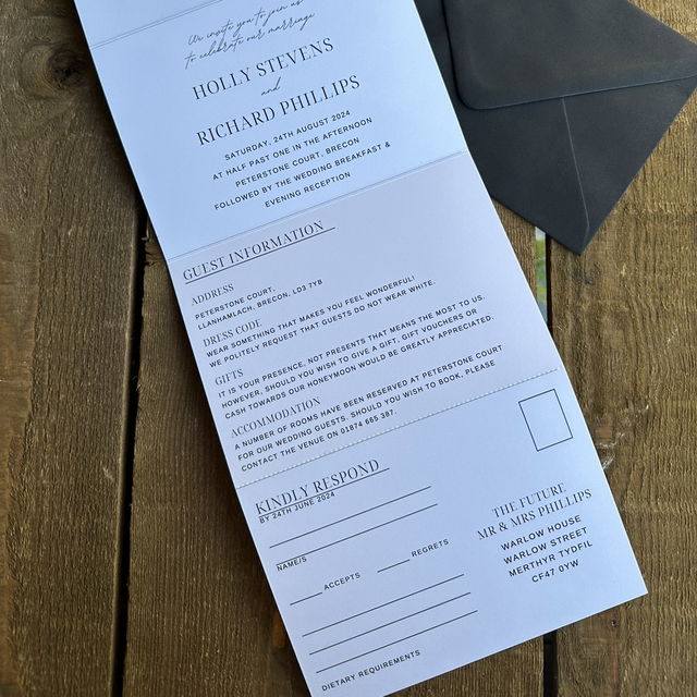 Modern minimal design - concertina wedding invitations - including guest information & tear off RSVP postcard