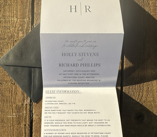 These beautiful invitations measure 148.5mm x 105mm when folded, and when opened up, they expand to an impressive 148.5mm x 420mm. With ample space for guest information, a wedding day timeline, and even a tear-off and return RSVP card, our concertina fold invitations are the epitome of elegance and functionality.