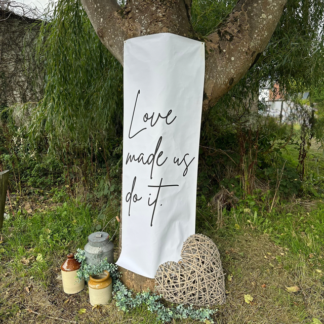 Make a statement on your wedding day with our oversized canvas wedding signs, printed on luxurious 330gsm canvas and measuring approx. 610mm x 2000mm. Perfect as a ceremony backdrop, welcome sign or feature display, each banner can be personalised with your names and wedding date. Choose from five modern romantic designs: Love made us do it, All because two people swiped right, Hey baby, I think I wanna marry you, Something so out of the ordinary or Welcome to our love story. These canvas signs are durable, easy to hang on a stand, tree, fence or door, and roll beautifully for storage. Even better – they make a gorgeous keepsake to display at home after your big day.