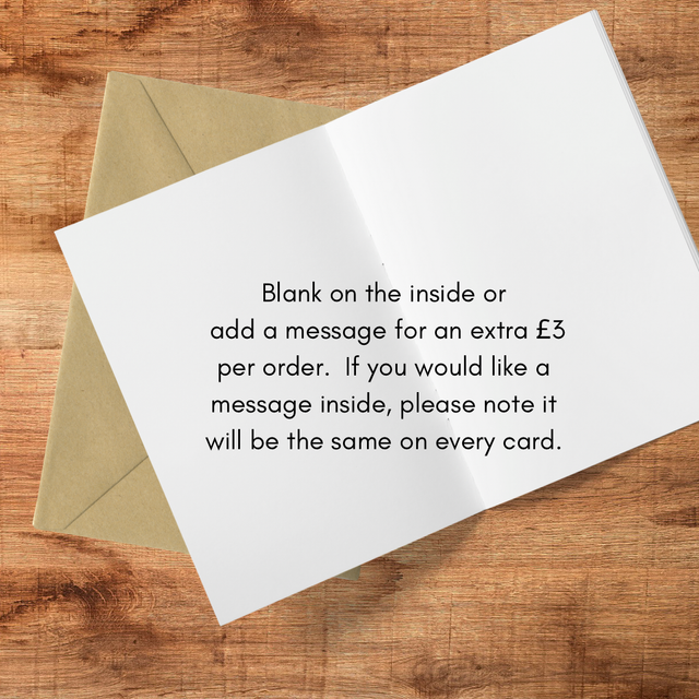 Professionally printed onto 300gsm silky bright white cardstock and supplied with Kraft brown envelopes. Once you place your order, please email your image and details to us quoting your order details.
