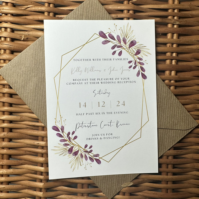 Pack of A6 evening invitations - plum and gold colour