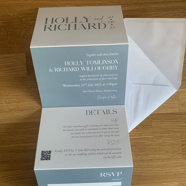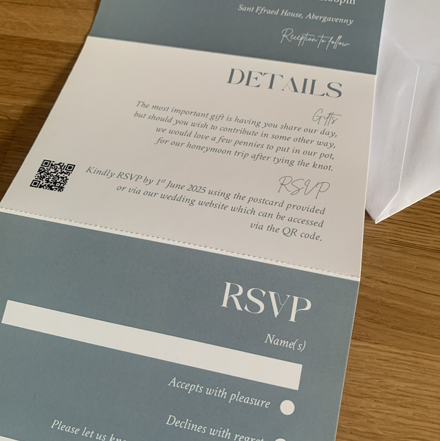 Pale dusty blue & white modern minimalist design - concertina wedding invitations - including guest information & tear off RSVP postcard