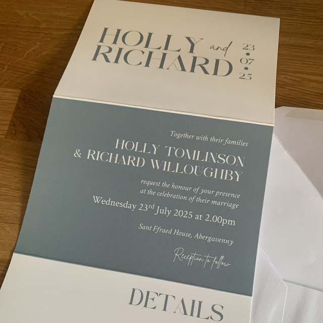These beautiful invitations measure 148.5mm x 105mm when folded, and when opened up, they expand to an impressive 148.5mm x 420mm. With ample space for guest information, a wedding day timeline, and even a tear-off and return RSVP card, our concertina fold invitations are the epitome of elegance and functionality.