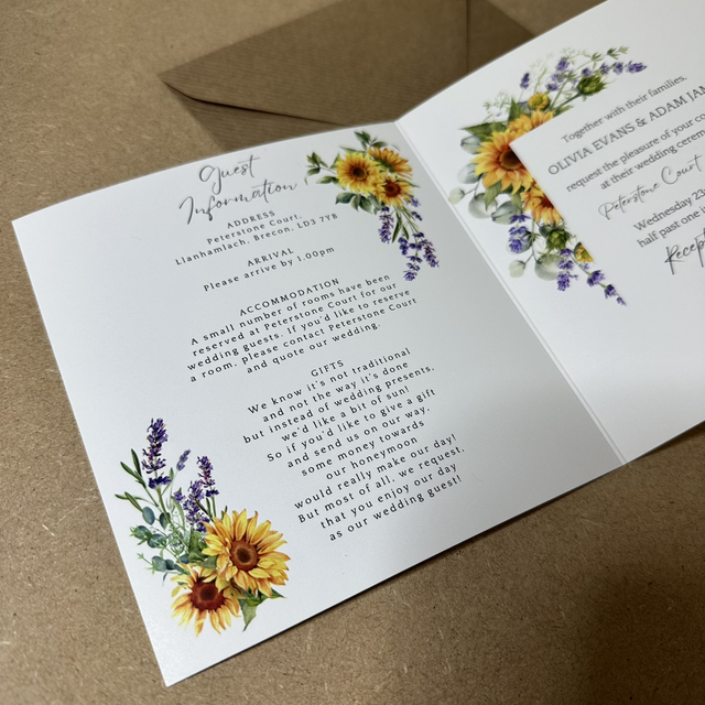 Sunflowers and lavender - square, tri-fold Wedding invitations - including guest information & RSVP