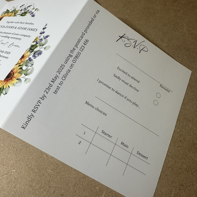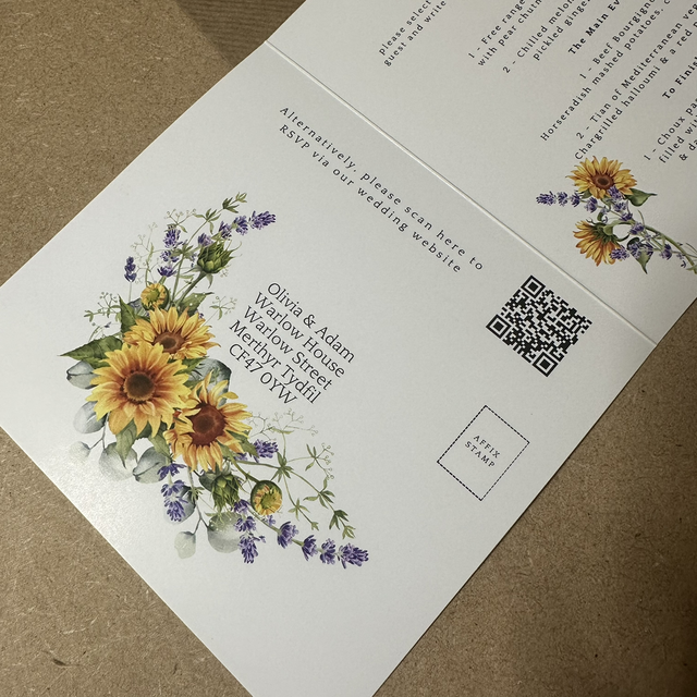 Our stunning sunflower and lavender design square tri fold wedding invitations are a bundle of sunshine! These beautiful invitations measure 148.5mm x 140mm when folded, and when opened up, they expand to an impressive 148.5mm x 420mm. With ample space for guest information, a wedding day timeline, and even a tear-off and return RSVP card, our tri fold invitations are the epitome of elegance and functionality.